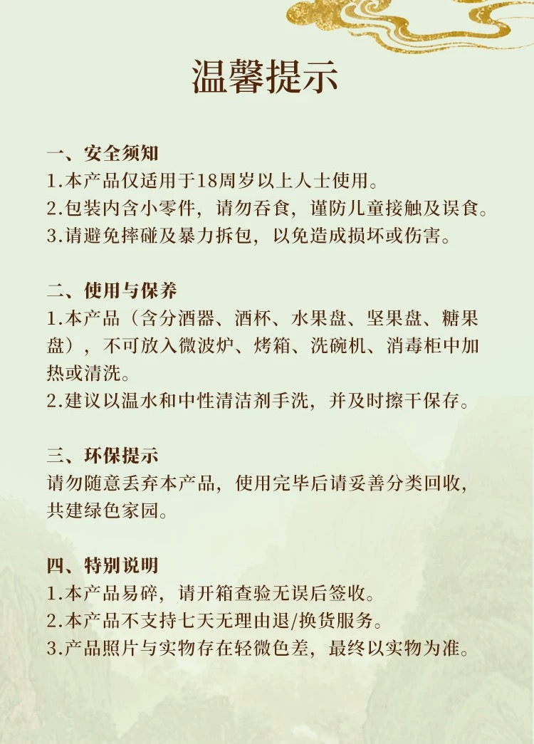 饮酒危害健康,合理饮酒,切勿过量;未成年人请勿购买酒类商品;孕妇、哺乳期妇女请勿饮酒;酒后请勿驾车。
